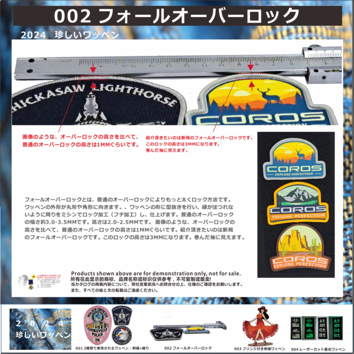 <p><span style="font-size:12pt"><span style="background:white"><span style="line-height:200%"><span style="font-family:宋体"><span lang="JA" style="font-size:10.5pt"><span style="line-height:200%"><span style="font-family:"Meiryo","sans-serif"">フォールオーバーロックとは、普通のオーバーロックによりもっと太くロック方法です。ワッペンの外形が丸形や角形に向きます。、ワッペンの形に型抜きを行い、縁がほつれないように周りをミシンでロック加工(フチ加工)し、仕上げます。普通のオーバーロックの幅さ約</span></span></span><span lang="EN-US" style="font-size:10.5pt"><span style="line-height:200%"><span style="font-family:"Meiryo","sans-serif"">3.0-3.5MM</span></span></span><span lang="JA" style="font-size:10.5pt"><span style="line-height:200%"><span style="font-family:"Meiryo","sans-serif"">です。高さは</span></span></span><span lang="EN-US" style="font-size:10.5pt"><span style="line-height:200%"><span style="font-family:"Meiryo","sans-serif"">2.0-2.5MM</span></span></span><span lang="JA" style="font-size:10.5pt"><span style="line-height:200%"><span style="font-family:"Meiryo","sans-serif"">です。</span></span></span></span></span></span></span></p>