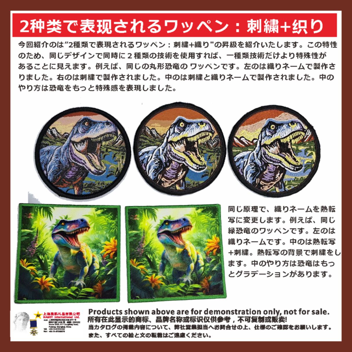 <h1 style="text-align:justify; margin-top:23px; margin-bottom:22px"><span style="font-size:22pt"><span style="line-height:16.0pt"><span style="font-family:Calibri,sans-serif"><span lang="JA" style="font-size:14.0pt"><span style="font-family:"Meiryo",sans-serif"><span style="font-weight:normal">一種類技術だけより特殊性があることに見えます。例えば、同じの丸形恐竜のワッペンです。左のは織りネームで製作さりました。右のは刺繍で製作されました。中のは刺繍と織りネームで製作されました。中のやり方は恐竜をもっと特殊感を表現しました。</span></span></span></span></span></span></h1>