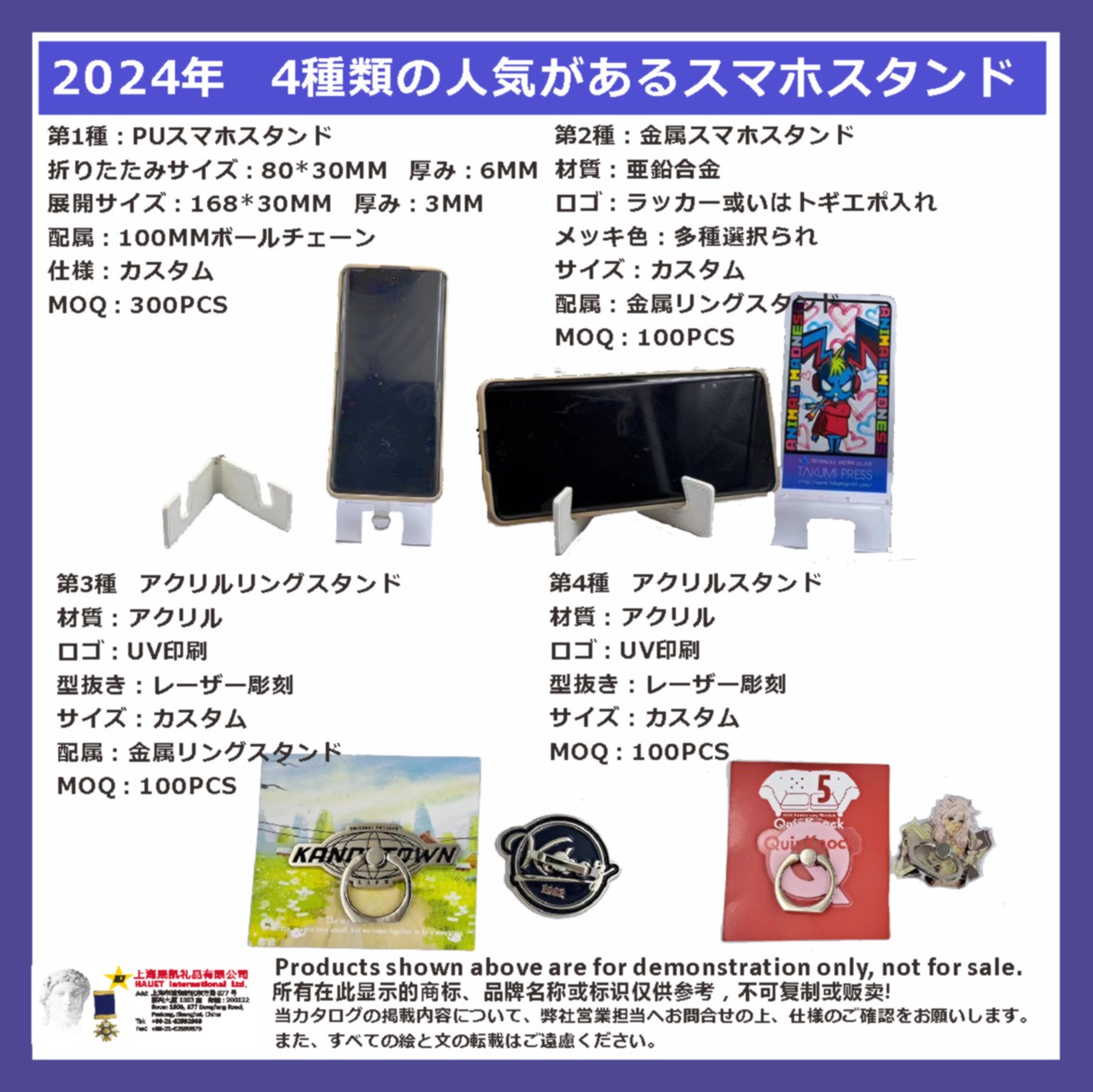 <h2>2024年に人気があるスマホスタンドを紹介させて頂きます。スマホスタンドは丈夫な金属から軽いアクリルまで、おしゃれ質感がある皮革のスタンドもあります。最小ロットも小さいし、お客様も絶対お気になります。</h2>