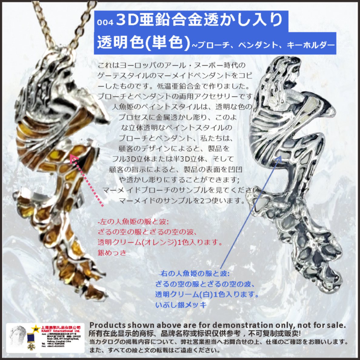これはヨーロッパのアール・ヌーボー時代のゲーテスタイルのマーメイドペンダントをコピーしたものです。低温亜鉛合金で作りました。ブローチとペンダントの両用アクセサリーです。人魚姫のペイントスタイルは、透明な色のプロセスに金属透かし彫り、このような立体透明なペイントスタイルのブローチとペンダント、私たちは、顧客のデザインによると、製品をフル3D立体または半3D立体、そして顧客の指示によると、製品の表面を凹凹や透かし彫りにすることができます;マーメイドブローチのサンプルを見てください。マーメイドのサンプルを2つ使います。<br />