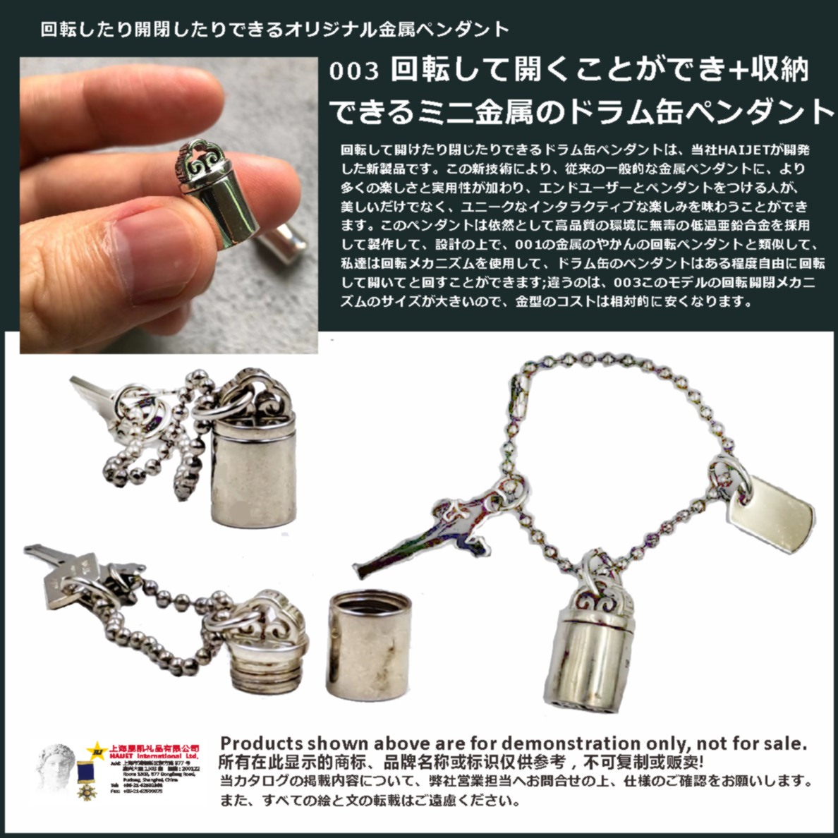 <h2>回転して開けたり閉じたりできるドラム缶ペンダントは、当社HAIJETが開発した新製品です。この新技術により、従来の一般的な金属ペンダントに、より多くの楽しさと実用性が加わり、エンドユーザーとペンダントをつける人が、美しいだけでなく、ユニークなインタラクティブな楽しみを味わうことができます。<br />