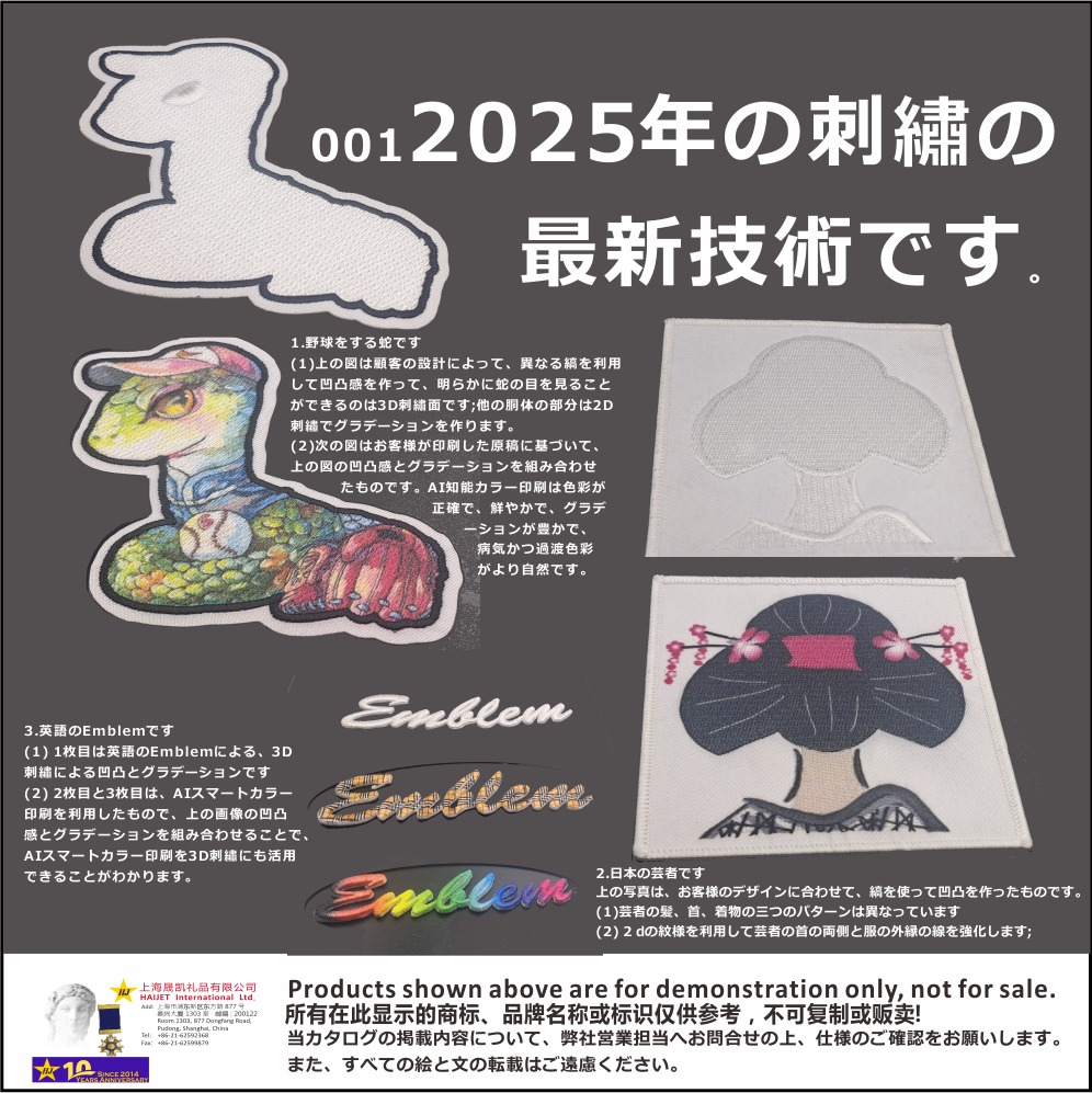 (2) 2枚目と3枚目は、AIスマートカラー印刷を利用したもので、上の画像の凹凸感とグラデーションを組み合わせることで、AIスマートカラー印刷を3D刺繡にも活用できることがわかります。</h2>