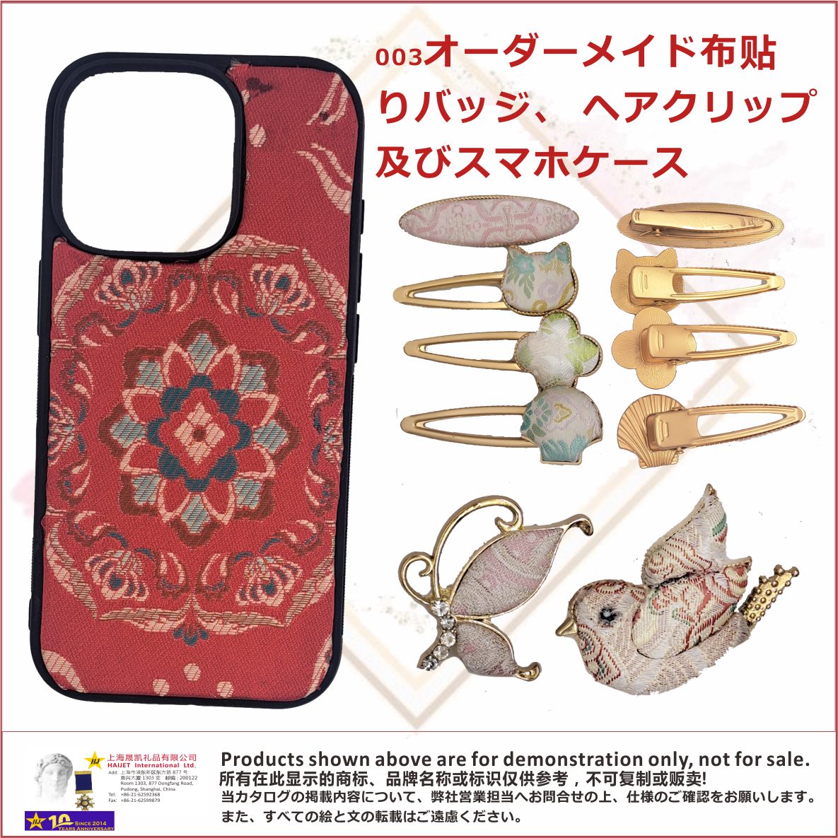 今回ご紹介するのは、異なる種類の布贴り(布製アップリケ)を使用した金属製バッジ、金属製ヘアクリップ及びPVC製スマホケースです。つまり、これらの金属バッジ、金属ヘアクリップ及びPVCスマホケースには既製のモデルがあり、顧客は好みの布贴りを選ぶだけで、その布贴りのデザインを金属バッジ、金属ヘアクリップ及びPVCスマホケースに施すことができます。<br />