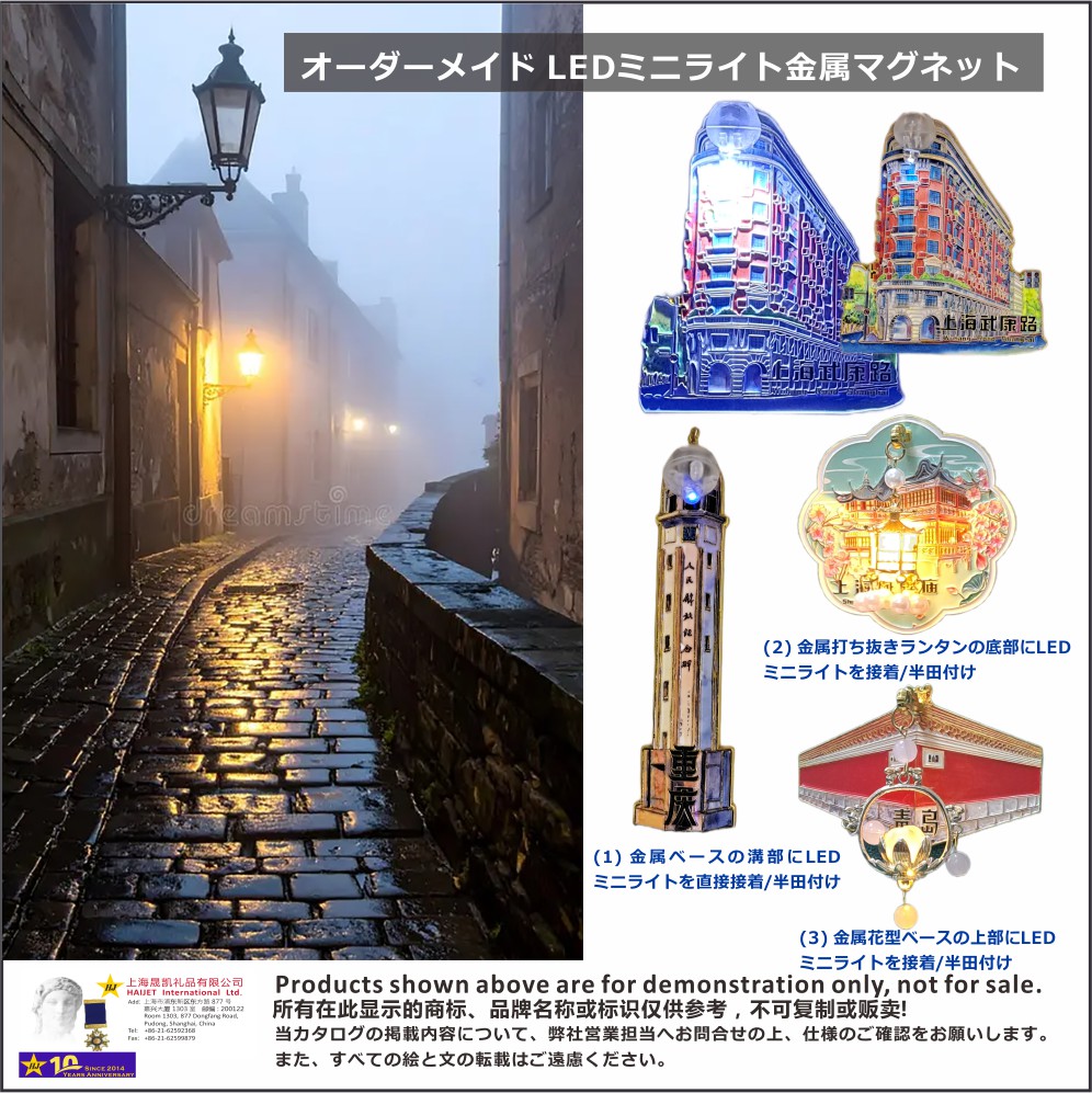 今回ご紹介するのは、LEDミニライトと金属マグネットを組み合わせた独特の効果で、顧客の参考に供するものです。これらの基本コンセプトを基に想象力を発揮し、お客様のエンドユーザー向けに更に特色ある金属バッジやマグネットを設計できます:</h2>